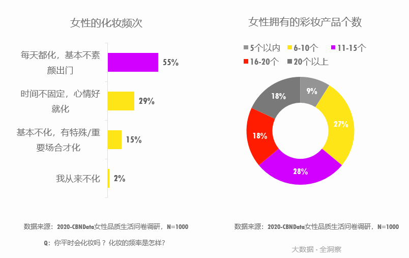 CBNData《報(bào)告》顯示,越來越多的女性開始關(guān)注對自己外在形象的話語權(quán),近年來彩妝消費(fèi)需求強(qiáng)勁。55%的女性每天化妝,64%的女性擁有10件以上的化妝品。