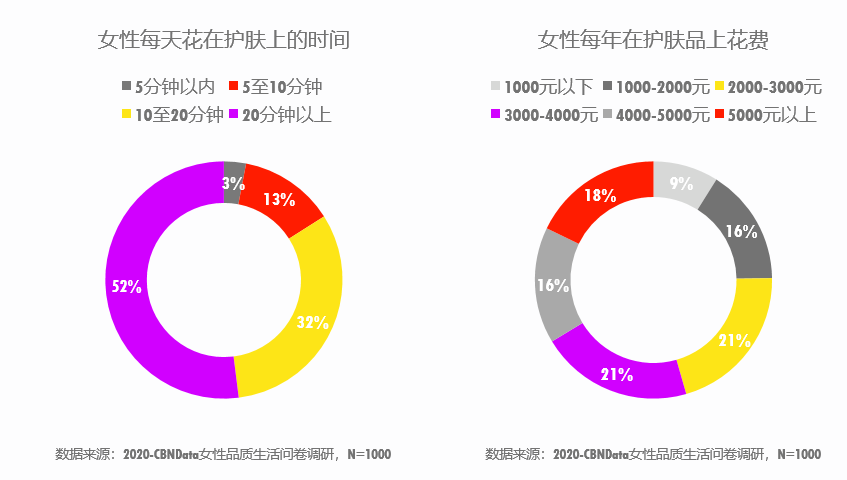 CBNData《報(bào)告》指出,近兩年內(nèi),護(hù)膚、口服美容等與顏值相關(guān)的品類帶動萬億級的消費(fèi)增長,其中洗臉儀、按摩儀、蒸臉儀等高科技美容儀備受青睞。55%的女性每年護(hù)膚品花費(fèi)超過3000元,超過半數(shù)的女性每天花在護(hù)膚上的時間超過20分鐘。