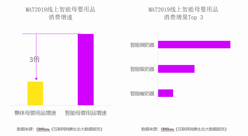 CBNData《報(bào)告》顯示,線上智能母嬰用品以高于整體品類平均3倍的增速發(fā)展,其中智能調(diào)奶器、智能吸奶器、智能暖奶器最受歡迎。