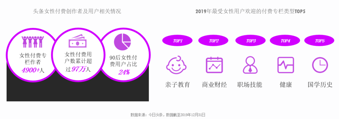 同時,越來越多的女性讀者開始愿意為優(yōu)質(zhì)內(nèi)容買單。以今日頭條為例,截至2019年底,全年平臺女性付費(fèi)專欄作者近5000人,女性付費(fèi)用戶有近百萬,其中90后占24%。在所有的付費(fèi)專欄里,親子教育、商業(yè)財(cái)經(jīng)和職場技能類專欄最受女性用戶喜歡。