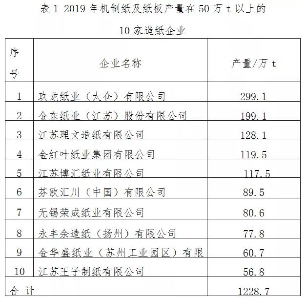 2019年機制紙及紙板產(chǎn)量達到10萬t的造紙企業(yè)共20家,產(chǎn)量在50萬t以上的企業(yè)有10家(見表1)。