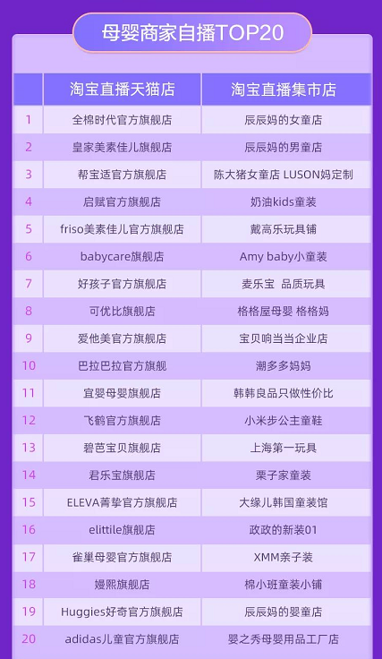 在母嬰領(lǐng)域,各品牌也在大力布局直播,據(jù)淘寶公開數(shù)據(jù),6月1日~6月18日母嬰商家自播TOP榜,幫寶適、babycare、好孩子、可優(yōu)比、愛他美、巴拉巴拉、好奇、Adidas等品牌的天貓官方旗艦店紛紛登榜。上榜母嬰親子TOP榜的品牌,在直播上也同樣表現(xiàn)優(yōu)秀。此次618大戰(zhàn)中,直播功不可沒,已經(jīng)成為商家業(yè)績增長一大新動力。