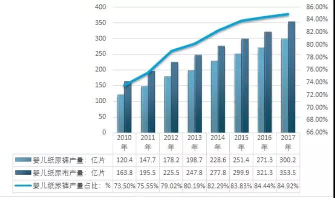 (2010-2017年中國嬰兒紙尿褲產量及占比情況)