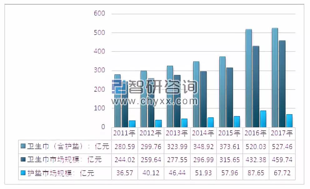 根據(jù)中國造紙協(xié)會生活用紙專業(yè)委員會的數(shù)據(jù),2011 年至2017年,衛(wèi)生巾(含護墊)消費量從839.6億片增加到1200.1 億片,市場規(guī)模從280.59億元擴大至527.46億元。
