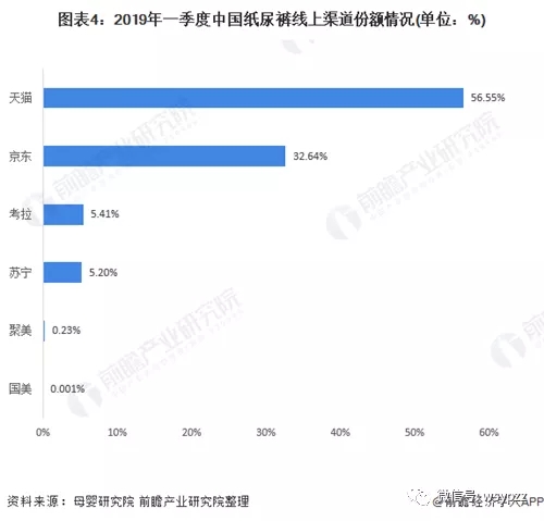 可見,線上渠道是紙尿褲銷售的重要渠道。2019年第一季度,紙尿褲銷售額達(dá)48.1億元,同比增長12.6%。其中天貓平臺保持其“一哥”優(yōu)勢,銷售額27.2億元,占比56.5%。京東平臺銷售額15.7億元,占比32.6%,同比增長6.1%。在增長率上,考拉出現(xiàn)了20.2%的負(fù)增長,蘇寧實(shí)現(xiàn)了214.8%的超高速增長。.jpg)