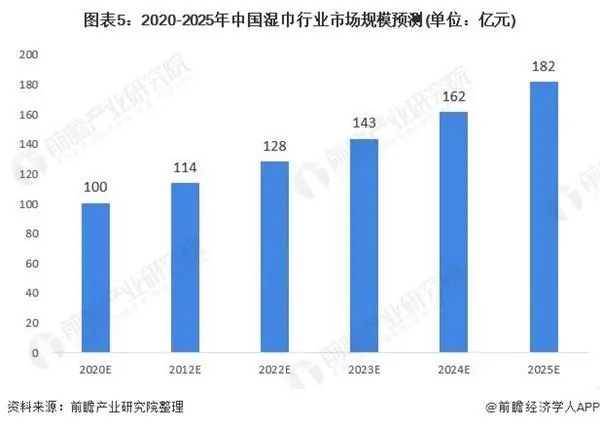 另一方面,2019年底全國疫情的爆發(fā)極大地刺激了濕巾的消費(fèi)需求。2020年1-5月,阿里濕巾線上銷售額均在1億元左右,2020年4月銷售額更是高達(dá)1.32億元,2020年2月環(huán)比增速達(dá)到113.63%。此次“新冠疫情”較2003年非典更加嚴(yán)重,進(jìn)一步激化了國人對(duì)衛(wèi)生健康的關(guān)注。同時(shí),隨著我國經(jīng)濟(jì)積極向好,居民消費(fèi)能力及意愿不斷提升,企業(yè)不斷探索制造多元化的濕巾,后疫情時(shí)代我國濕巾行業(yè)發(fā)展前景更為明朗,預(yù)計(jì)2025年市場規(guī)模有望達(dá)到182億元。