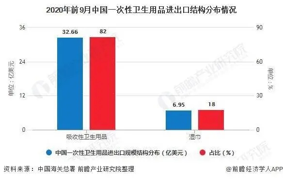 由于一次性衛(wèi)生用品種類繁多,大致分為吸收性衛(wèi)生用品和濕巾,在進(jìn)出口中,吸收性衛(wèi)生用品占據(jù)主要比重,達(dá)到82%的份額。