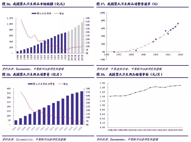 3.人均使用量的提升。伴隨著衛(wèi)生意識(shí)的提高,消費(fèi)升級趨勢以及嬰兒衛(wèi)生用品新產(chǎn)品的更新?lián)Q代,家長們會(huì)更加注重紙尿褲安全性與舒適感,不斷提高使用更換頻次。根據(jù)測算,日本市場出現(xiàn)波動(dòng)前每個(gè)適齡嬰幼兒(0-3歲)的每日使用量約為6.5片,美國市場的長期均值水平為4.5片/日;對比之下,盡管出現(xiàn)提升趨勢,我國當(dāng)前的人均使用量為2片/日,較發(fā)達(dá)成熟市場存在較大差距,未來有望進(jìn)一步提升至4-6片/日的區(qū)間內(nèi)。