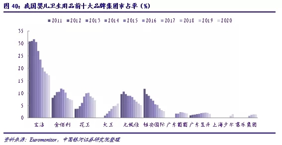 我國嬰兒衛(wèi)生用品市場內(nèi)頭部公司CR5僅為42.4%,頭部品牌CR5為40.0%,且持續(xù)處于下滑階段。其主要原因在于行業(yè)格局未定,新興國產(chǎn)品牌高速發(fā)展擠壓了現(xiàn)有品牌的市場份額,原處于寡頭地位的寶潔幫寶適為代表的海外品牌份額大幅下滑。長期來看,國產(chǎn)品牌或可在渠道、營銷以及本土產(chǎn)品研發(fā)的支持下,不斷提升性價(jià)比的競爭優(yōu)勢,達(dá)到與部分國際品牌抗衡的規(guī)模體量。