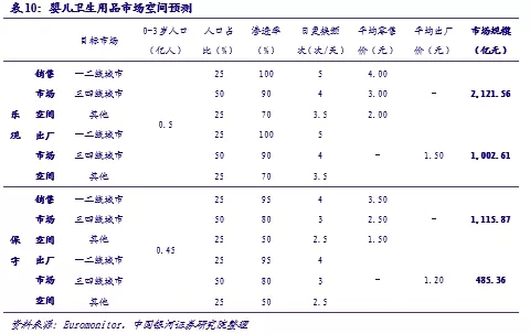考慮到滲透率、日均使用量以及產(chǎn)品價(jià)格帶多種因素的差異,我們同樣按照不同地區(qū)劃分對嬰兒衛(wèi)生用品市場規(guī)模進(jìn)行了預(yù)測。其中因?yàn)?-3歲區(qū)間內(nèi)不同年齡段嬰兒的日均更換頻次不同,預(yù)測中進(jìn)行了取均數(shù)處理,通常新生兒每日應(yīng)該更換6-8次,隨著年齡的增長時(shí)間間隔可以逐步拉長。綜上,我們樂觀預(yù)期我國嬰兒衛(wèi)生用品的終端市場規(guī)模約2100億元,保守也可達(dá)到1100億元,較20年市場規(guī)模有60%-200%的提升空間;出廠價(jià)按照樂觀1.50元/片、保守1.20元/片的行情預(yù)測,出廠市場規(guī)模也可達(dá)到490-1000億元。