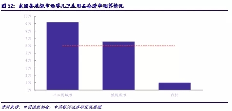 2.三四線城市以及農(nóng)村市場滲透率的提升。根據(jù)現(xiàn)有數(shù)據(jù)測算,各地的嬰兒衛(wèi)生用品滲透率存在明顯差異,三四線等中低消費(fèi)等級城市與農(nóng)村地區(qū)嬰兒紙尿褲的滲透率仍然有待提升,由此可以帶來整體消費(fèi)量的提升空間。