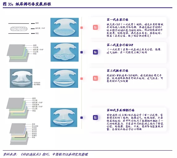 自香港的瑞德國際旗下品牌Fitti菲比(1992年),以及金佰利旗下品牌好奇(1994年)進(jìn)入中國大陸市場,我國嬰兒衛(wèi)生用品行業(yè)經(jīng)歷了快速發(fā)展,產(chǎn)品在材質(zhì)、結(jié)構(gòu)等層面不斷迭代更新。行業(yè)整體與其核心——芯體的發(fā)展歷程相近,以2006年為階段性節(jié)點(diǎn),在此之前,我國的嬰兒衛(wèi)生用品行業(yè)以外資品牌為主,好奇、幫寶適、媽咪寶貝等國際品牌集中進(jìn)入中國市場,產(chǎn)品芯體雖有結(jié)構(gòu)分區(qū)的變化,但以絨毛漿和SAP材質(zhì)為主導(dǎo);2006年不含絨毛漿的復(fù)合芯體結(jié)構(gòu)出現(xiàn),此后國內(nèi)品牌大舉擴(kuò)張,市場內(nèi)多品牌混戰(zhàn)。