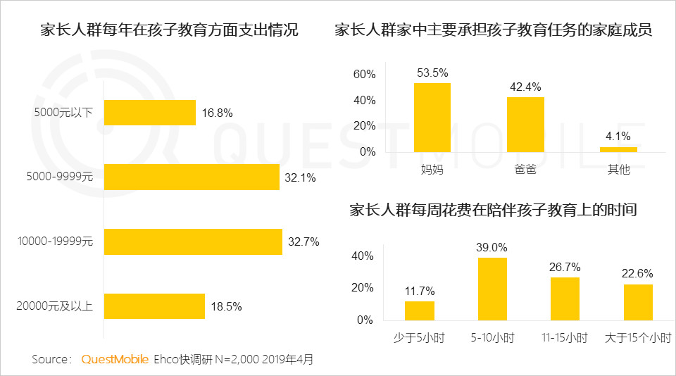 而在家庭人群每年在孩子教育方面支出情況,超八成的家長每年在孩子的教育方面支出均在5000元以上,其中10000-19999元占32.7%,5000-9999元占32.1%??梢娙藗儗τ诤⒆拥慕逃砷L真是寄予厚望。而在家長人群中媽媽作為主要承擔(dān)孩子教育任務(wù)占53.5%。從中可以看到在孩子的教育問題上,“媽媽”才是教育決策的主要決策者。而在家長人群每周花費(fèi)在陪伴孩子教育上的時(shí)間5-10小時(shí)占比最高,達(dá)到39%。