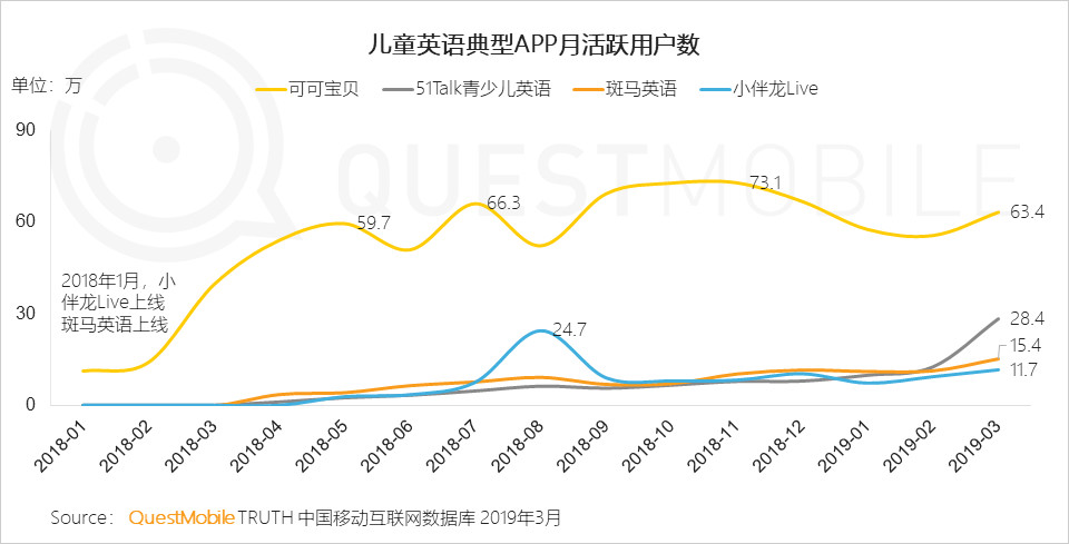 在兒童英語典型APP月活躍用戶數(shù)來看,小伴龍活躍用戶數(shù)最高為63.4萬,其次為51Talk青少兒英語。