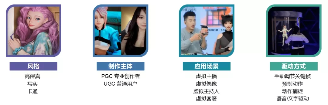 對(duì)于虛擬人的技術(shù)分類,我們可以從風(fēng)格、創(chuàng)作主體、應(yīng)用場(chǎng)景、驅(qū)動(dòng)方式幾個(gè)方面進(jìn)行了解: