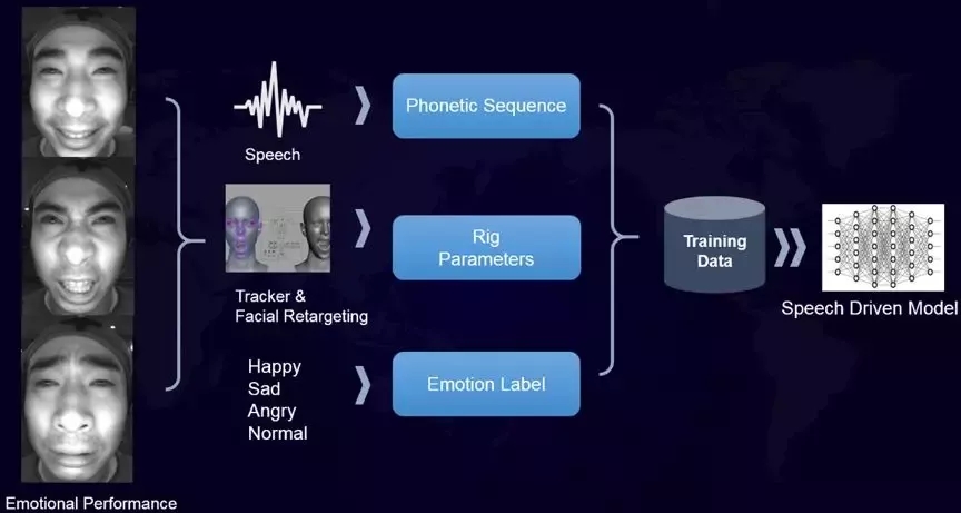 為此,團(tuán)隊(duì)建立了一套精確的面部動(dòng)捕流程,以不同情感下的動(dòng)作捕捉,來訓(xùn)練語音驅(qū)動(dòng)模型,最終構(gòu)造了一個(gè)長(zhǎng)約20個(gè)小時(shí)、13339條語句的,包含語音、面部運(yùn)動(dòng)和身體運(yùn)動(dòng)的多模態(tài)訓(xùn)練數(shù)據(jù)集。在Siren AI 基礎(chǔ)上,增加情感維度數(shù)據(jù),讓Matt擁有微笑、蹙眉等微表情,多了更自然的“人情味”。