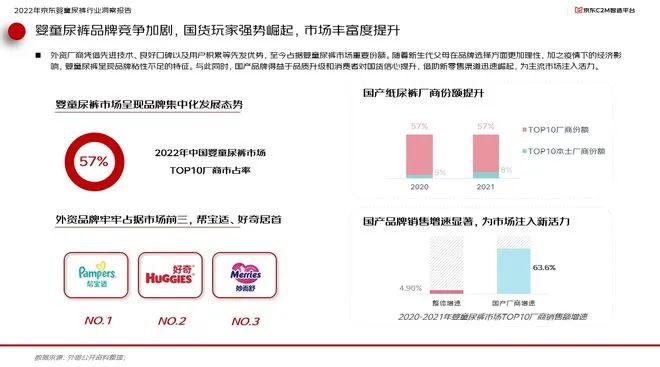 面對(duì)市場(chǎng)空間的變化,國內(nèi)嬰童尿褲品牌競(jìng)爭(zhēng)加劇。其中外資廠商憑借先進(jìn)技術(shù)、良好口碑以及用戶積累等先發(fā)優(yōu)勢(shì),至今占據(jù)嬰童尿褲市場(chǎng)重要份額。而一方面,隨者新生代父母在品牌選擇方面更加理性,加之疫情下的經(jīng)濟(jì)影響,嬰單尿褲也呈現(xiàn)出品牌粘性不足的特征。與此同時(shí),得益于品質(zhì)升級(jí)和消費(fèi)者對(duì)國貨信心的提升,國貨品牌借助新零售渠道迅速崛起,為主流市場(chǎng)注入活力。報(bào)告顯示,本土頭部廠商份額從2020年的5%迅速提升至2021年的8%,而國產(chǎn)廠商銷售額年增速則達(dá)到63.6%,遠(yuǎn)超行業(yè)整體增速的4.9%。