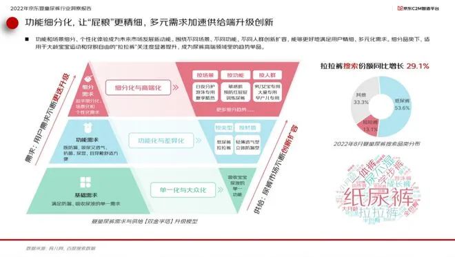 在產(chǎn)品細(xì)分賽道方面,功能和場(chǎng)景細(xì)分、個(gè)性化體驗(yàn)成為未來市場(chǎng)發(fā)展新動(dòng)能。圍繞不同場(chǎng)景、不同功能、不同人群創(chuàng)新擴(kuò)容,能夠更好地滿足用戶精細(xì)、多元化的需求。細(xì)分品類下,適用于大齡寶寶運(yùn)動(dòng)和穿脫自由的“拉拉褲”關(guān)注度顯著提升,成為高端尿褲領(lǐng)域里的趨勢(shì)單品。報(bào)告顯示,2022年8月,“拉拉褲”關(guān)鍵詞搜索份額同比提升29.1%。讓“屁糧"更精細(xì),多元需求加速供給端升級(jí)創(chuàng)新。