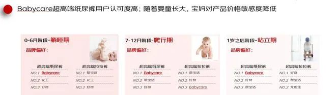 報(bào)告還對(duì)國產(chǎn)母嬰用品品牌Babycare進(jìn)行了解析,發(fā)現(xiàn)該品牌的超高端紙尿褲用戶認(rèn)可度高,無論是0-6個(gè)月,還是7-12個(gè)月,以及1歲之后階段,Babycare超高端紙尿褲都是用戶品牌偏好榜首。而且隨著嬰童長大,寶媽對(duì)產(chǎn)品價(jià)格敏感度降低,Babycare超高端紙尿褲成為了諸多寶媽的首選產(chǎn)品。