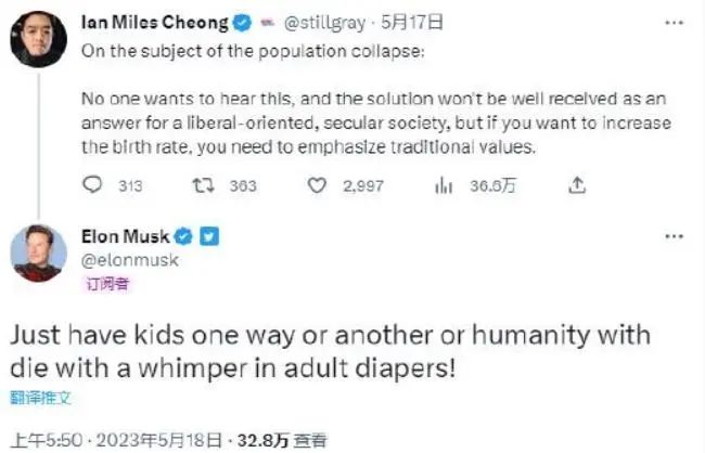 “不管怎樣要生娃,否則人類就會裹著成人紙尿褲在嗚咽聲中消亡!”馬斯克發(fā)推稱。這不是他第一次用成人紙尿褲來形容人口危機和老齡化問題的嚴重程度。