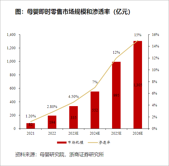 年輕母嬰用戶對(duì)于“即時(shí)性”“便捷化”的追求,推動(dòng)母嬰即時(shí)零售渠道的狀態(tài),截止2022年該渠道規(guī)模約194億元,預(yù)計(jì)2026年將達(dá)1305億元,年復(fù)合增長(zhǎng)74%,勢(shì)頭尤為猛烈。