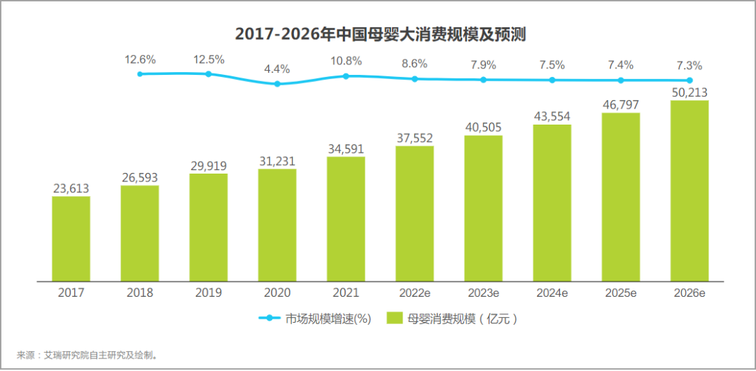 據(jù)艾瑞咨詢數(shù)據(jù)顯示,自2017年中國(guó)母嬰消費(fèi)規(guī)模持續(xù)增速基本保持在10%以上,其中再受疫情影響的2020年下滑至4.4%之后已經(jīng)逐漸回暖。