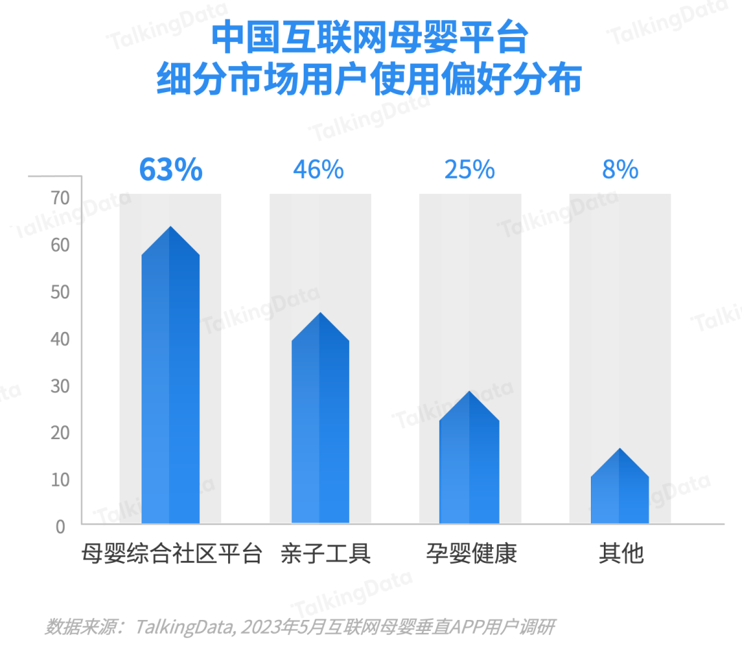 使用母嬰綜合社區(qū)的母嬰平臺(tái)用戶(hù)占比更高,達(dá)到63%,這表明用戶(hù)更偏愛(ài)涵蓋工具+社區(qū)等復(fù)合型垂直平臺(tái)。
