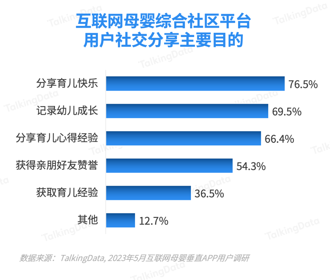 對(duì)于分享目的,超過(guò)7成用戶(hù)愿意分享育兒過(guò)程中的快樂(lè)和幸福,傳遞正能量;同時(shí),69.5%用戶(hù)是為了記錄孩子成長(zhǎng)的過(guò)程,66.4%的用戶(hù)是為了分享育兒心得經(jīng)驗(yàn)。
