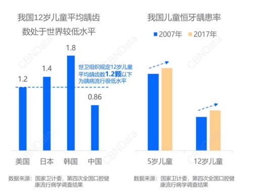 根據(jù)第四次全國口腔健康流行病學(xué)調(diào)查結(jié)果顯示,中國5歲兒童乳牙齲患(即蛀牙)率為70.9%,12歲兒童恒牙齲患率為34.5%。與十年前相比,5歲和12歲兒童齲患率分別上升了5.8%、7.8%。這也意味著,我國兒童口腔問題日益加劇。