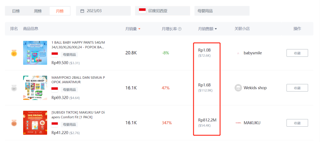 3月- Top1的商品為兒童紙尿褲,月銷量為20.8K,月銷售額為72.6K(美金)月增長(zhǎng)率為-8%,Top2的商品是紙尿褲組合,月銷量為26.2K,銷售額為87.8K(美金)月增長(zhǎng)率為62%,Top3的商品為紙尿褲,月銷量為16.1K,月銷售額為54.4K(美金)月增長(zhǎng)率為347%。