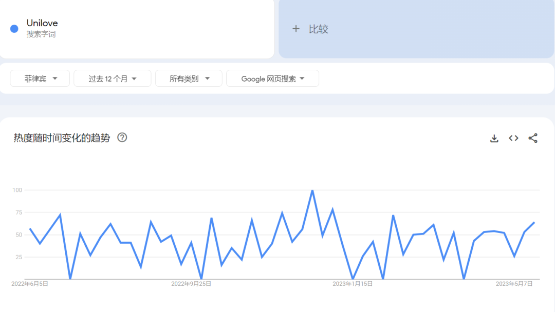 通過(guò)Google Trends我們可以了解到一定時(shí)期內(nèi),產(chǎn)品關(guān)鍵詞在搜索引擎上的搜索熱度和市場(chǎng)趨勢(shì)。從下方搜索趨勢(shì)不難看出,菲律賓地區(qū)在2022年全年關(guān)于“unilove”的搜索熱度平穩(wěn),并且在2023年3-4月有上升趨勢(shì),從搜索趨勢(shì)上可以看出,unilove在菲律賓市場(chǎng)形成了穩(wěn)定的品牌曝光。