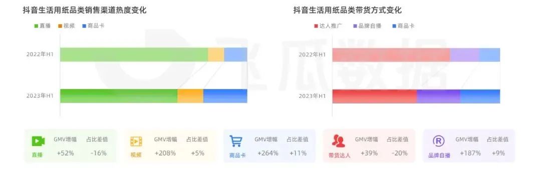 根據(jù)去年生活用紙TOP5品牌渠道銷售增幅變化數(shù)據(jù)顯示,相較于其他渠道方式,直播帶貨銷售額總體上較22年增長(zhǎng)額最大,最高可達(dá)至184%,內(nèi)容場(chǎng)與貨架場(chǎng)齊頭并進(jìn),加速品牌生意爆發(fā)。