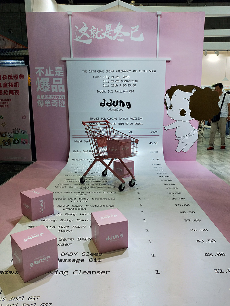冬己展位結(jié)合卡通IP做出購(gòu)物車和賬單的場(chǎng)景,巧妙地利用場(chǎng)地空間制造立體視覺(jué),頗具想象力的設(shè)計(jì)實(shí)現(xiàn)有效地引流。