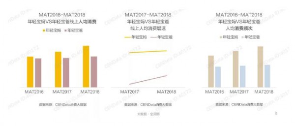 在更為開放、富足的環(huán)境下成長(zhǎng)起來的80、90后年輕一代,大多受過良好的教育,生活水平也有所提高,他們?cè)谟齼河^念上更加開放,在包括紙尿褲在內(nèi)的眾多母嬰用品上,年輕寶爸寶媽更舍得花錢,他們有強(qiáng)烈的消費(fèi)意愿,還具備足夠的支付能力,成為母嬰消費(fèi)市場(chǎng)的中堅(jiān)力量。數(shù)據(jù)顯示,近年來,年輕寶媽寶爸的線上人均消費(fèi)逐年提升。相比寶爸,寶媽的增速更快,達(dá)到兩位數(shù)的高速增長(zhǎng),消費(fèi)潛力巨大。從消費(fèi)頻次來看,年輕寶媽更愛剁手,他們的消費(fèi)頻次遠(yuǎn)高于寶爸。
